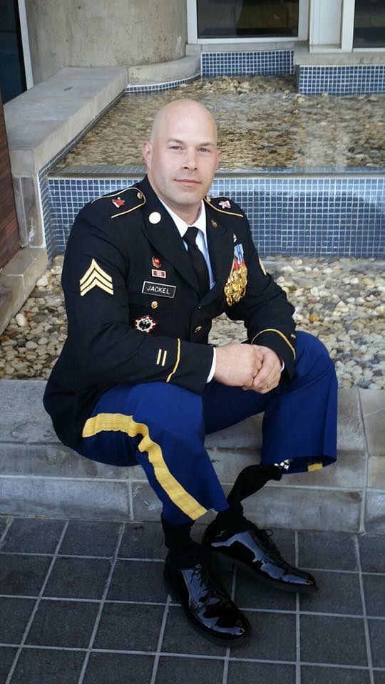 While on convoy in Afganistan on August 23, 2011 Jackel was injured when an improvised explosive device (IED) exploded underneath his RG31 vehicle. The force of the blast knocked Jackel unconscious. When Jackel regained consciousness he realized that he was trapped inside the burning vehicle, and his team members were pinned and unable to move. While attempting to escape and save the lives of his fellow soldiers, Jackel used his amputated leg to put out the flames around him before finding an exit through the hatch at the top of the vehicle. With the hatch open, he assisted his team out of the burning vehicle. The blast left Jackel with severe injuries, including bilateral below the knee amputations and a traumatic brain injury. He also suffered multiple soft tissue injuries from shrapnel.